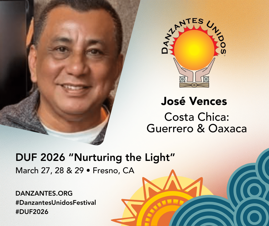 Danzantes Unidos DUF 2026 “Nurturing the Light” welcomes José Vences teaching Costa Chica: Guerrero & Oaxaca for Teens & Adults; ages 15+. Jose Vences was born and raised in Morelos, Mexico where he began his training and love of dance at the age of sixteen. He studied dance with Jesus Parra Duje at the Universidad Autonoma de Morelos in 1983 while earning a degree as an elementary school teacher. He was honored with...